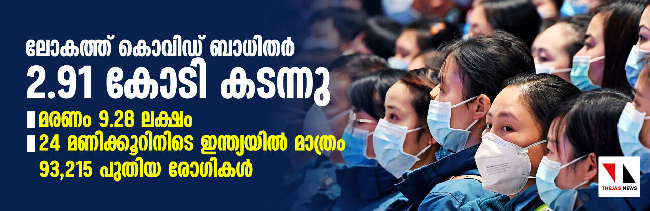 ലോകത്ത് കൊവിഡ് ബാധിതര് 2.91 കോടി കടന്നു; മരണം 9.28 ലക്ഷം, 24 മണിക്കൂറിനിടെ ഇന്ത്യയില് മാത്രം 93,215 പുതിയ രോഗികള്
