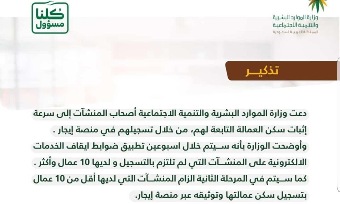 പത്തില് കൂടുതല് തൊഴിലാളികളുള്ള സ്ഥാപനങ്ങള് ഈജാറില് ഉടന് രജിസ്റ്റര് ചെയ്യണം
