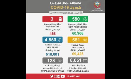 കൊവിഡ്: കുവൈത്തില് ഇന്ന് പുതിയ 651 കേസുകള്; മൂന്ന് മരണം കൂടി, രോഗമുക്തര് 580