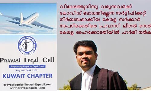 കൊവിഡ് ബാധയില്ലെന്ന സര്ട്ടിഫിക്കറ്റ്: കേരള സര്ക്കാര് നടപടിക്കെതിരേ ഹൈക്കോടതിയില് ഹരജി നല്കി പ്രവാസി ലീഗല് സെല്