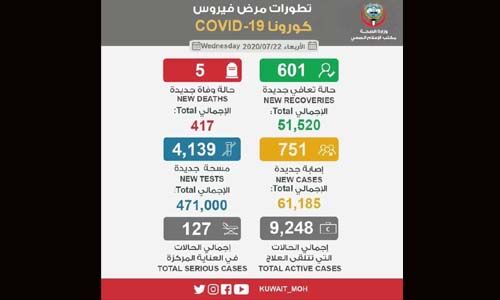 കൊവിഡ്: കുവൈത്തില് ഇന്ന് അഞ്ച് മരണം; 429 സ്വദേശികള് അടക്കം 751 പേര്ക്ക് വൈറസ് ബാധ