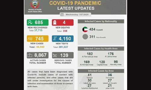 ഫര്വാനിയ- 182, അഹമദി- 168, ഹവല്ലി- 98, കേപിറ്റല്- 120, ജഹറ- 176. രോഗബാധ സ്ഥിരീകരിക്കപ്പെട്ടവരുടെ താമസകേന്ദ്രങ്ങള് അടിസ്ഥാനമാക്കിയുള്ള എണ്ണം: തൈമ- 41, സബാഹ് സാലെം- 30, സബാഹിയ- 27, ഫര്വാനിയ- 36, ജിലീബ്- 27, സുലൈബിയ, താമസപ്രദേശം- 27, ജാബര് അല് അലി- 21. ഇന്ന് 685 പേരാണ് രോഗമുക്തി നേടിയത്. ഇതോടെ ആകെ രോഗം സുഖമായവരുടെ എണ്ണം 37,715 ആയി. ആകെ 8,867 പേരാണു ഇപ്പോള് ചികില്സയില് കഴിയുന്നത്. ഇവരില് 139 പേര് തീവ്രപരിചരണവിഭാഗത്തിലാണുള്ളത്.