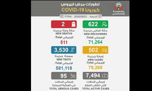 കൊവിഡ്: കുവൈത്തില് ഇന്ന് രണ്ടുമരണം; 502 പേര്ക്കു രോഗം, 622 പേര്ക്ക് രോഗമുക്തി