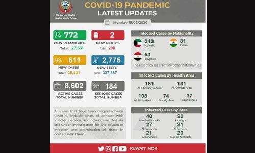 ഇന്ന് രോഗം സ്ഥിരീകരിക്കപ്പെട്ടവര് സമ്പര്ക്കം വഴിയും ഉറവിടം അന്വേഷണത്തിലുമുള്ള വിഭാഗത്തില്പെട്ടവരാണ്. വൈറസ് ബാധിതരുടെ ആരോഗ്യമേഖല തിരിച്ചുള്ള കണക്കുകള് ഇപ്രകാരമാണ്. ഫര്വാനിയ- 161, അഹമദി- 131, ഹവല്ലി- 74, കേപിറ്റല്- 37, ജഹറ- 108. രോഗികളുടെ താമസകേന്ദ്രങ്ങള് അടിസ്ഥാനമാക്കിയുള്ള കണക്ക് പ്രകാരം ഫര്വാനിയ- 27, ജിലീബ്- 40, സബാഹിയ- 29, ഫിര്ദൗസ്- 21, ഫഹാഹീല്- 21, സഅദ് അബ്ദുല്ല- 20 എന്നിങ്ങനെയാണ് വൈറസ് റിപോര്ട്ട് ചെയ്യപ്പെട്ടിരിക്കുന്നത്.