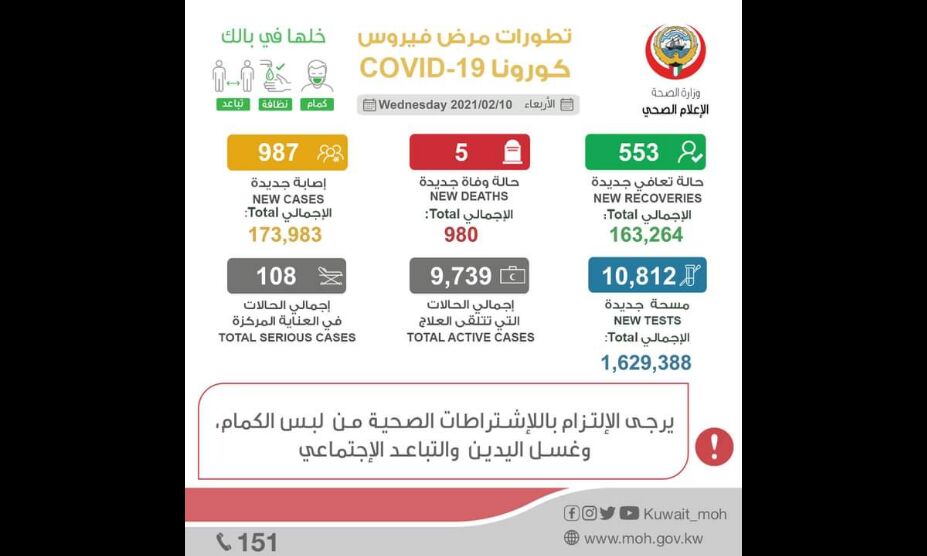 കുവൈത്തില് ഇന്ന് 987 പേര്ക്ക് കൊറോണ; 5 മരണം