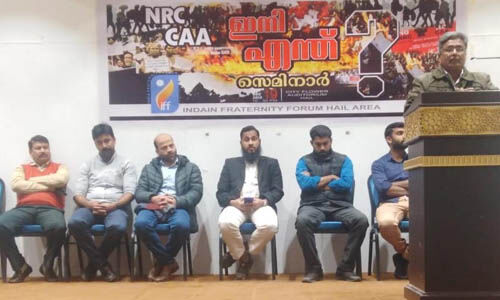 ഹായില്: പൗരത്വ ഭേദഗതി നിയമത്തിനെതിരേ 'എന്ആര്സി-സിഎഎ ഇനി എന്ത്' എന്ന വിഷയത്തില് ഇന്ത്യ ഫ്രറ്റേണിറ്റി ഫോറം ഹായില് ഏരിയാ പ്രതിഷേധ സെമിനാര് സംഘടിപ്പിച്ചു. ഹായിലിലെ വിവിധ രാഷ്ട്രീയ സാമൂഹികസംഘടനകളെ പങ്കെടുപ്പിച്ച് നടന്ന പരിപാടി ജനപങ്കാളിത്തംകൊണ്ട് ശ്രദ്ധേയമായി. സെമിനാറില് വിഷയം അവതരിപ്പിച്ചുകൊണ്ട് അബ്ദു ഉപ്പള സംസാരിച്ചു. രാജ്യത്തിന്റെ ഭരണഘടനയെ അട്ടിമറിച്ചുകൊണ്ട് നടപ്പാക്കിയ നിയമത്തിനെതിരേ സംഘടനാ പക്ഷപാതം മറന്നുകൊണ്ട് എല്ലാ പ്രവാസികളും ഒന്നിച്ചുനിന്ന് പ്രതിഷേധിക്കണമെന്നു അദ്ദേഹം സൂചിപ്പിച്ചു.