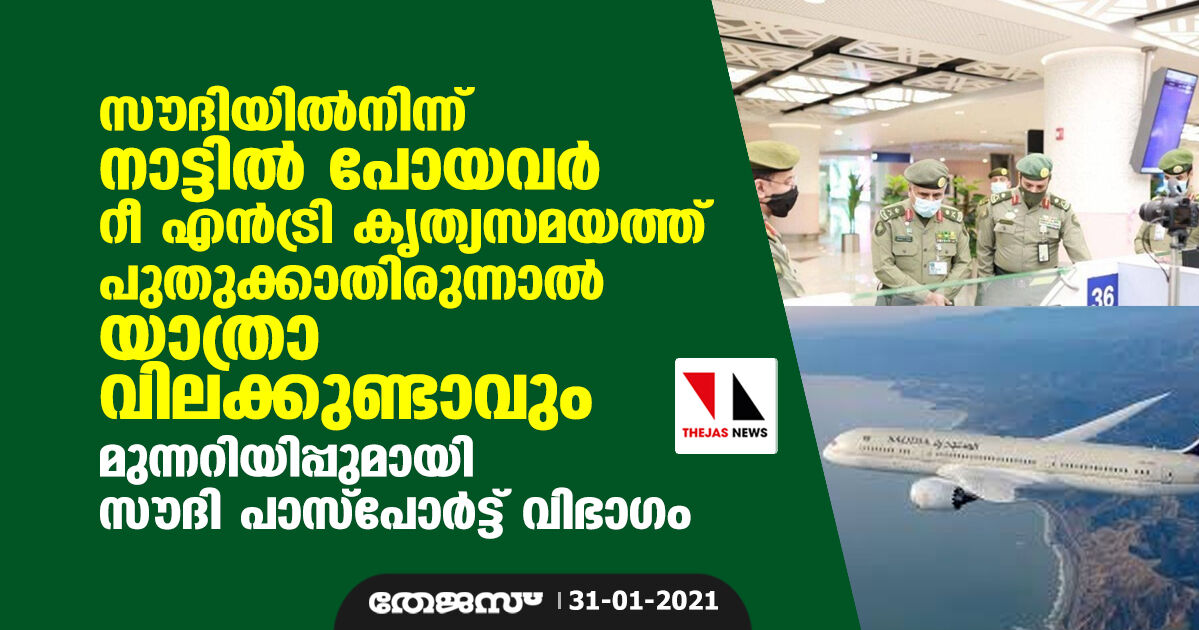 സൗദിയില്നിന്ന് നാട്ടില് പോയവര് റീ എന്ട്രി കൃത്യസമയത്ത് പുതുക്കാതിരുന്നാല് യാത്രാ വിലക്കുണ്ടാവും; മുന്നറിയിപ്പുമായി സൗദി പാസ്പോര്ട്ട് വിഭാഗം