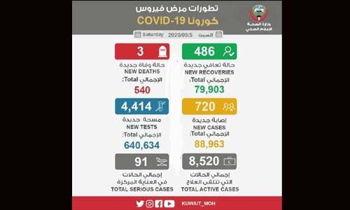 കുവൈത്തില് മൂന്ന് കൊവിഡ് മരണം കൂടി; 540 പേര്ക്ക് ഇന്ന് വൈറസ് സ്ഥിരീകരിച്ചു
