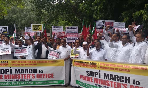 ന്യൂഡല്ഹി: പ്രളയം ദുരന്തം വിതച്ച കേരളത്തോട് കേന്ദ്ര സര്ക്കാര് കാണിക്കുന്ന അവഗണനയില് പ്രതിഷേധിച്ച് സോഷ്യല് ഡമോക്രാറ്റിക് പാര്ട്ടി ഓഫ് ഇന്ത്യ(എസ്ഡിപിഐ) കേരള സംസ്ഥാന കമ്മിറ്റിയുടെ ആഭിമുഖ്യത്തില് പ്രധാനമന്ത്രിയുടെ ഓഫിസിലേക്ക് നടക്കുന്ന മാര്ച്ചിന് തുടക്കമായി.