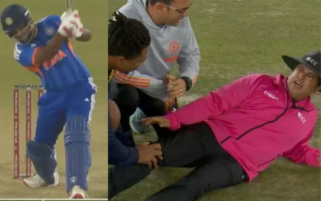 ഇന്ത്യന് ഇന്നിങ്സിന്റെ ഒന്പതാം ഓവറിലാണ് സംഭവം. സ്പിന്നര് ഡൊണോവന് ഫെരെയ്ര എറിഞ്ഞ ഓവറിലെ നാലാം പന്തിലാണ് അമ്പയര്ക്ക് പരിക്കേല്ക്കുന്നത്. ഓവറിലെ ആദ്യ രണ്ട് പന്തുകളും തിലക് വര്മ ഫോറടിച്ചു. മൂന്നാം പന്തില് സിംഗിളെടുത്തു. നാലാം പന്ത് നേരിട്ട സഞ്ജു നേരേ ബൗളറുടെ നേര്ക്കാണ് ഷോട്ടടിച്ചത്. ബൗളറുടെ കൈയ്യില് തട്ടിയശേഷം പന്ത് അമ്പയറുടെ കാല് മുട്ടില് കൊള്ളുകയായിരുന്നു.