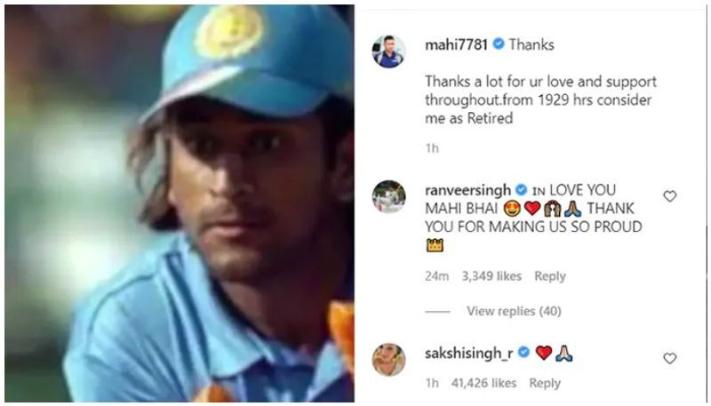 എംഎസ് ധോണിയുടെ ഭാര്യ സാക്ഷി സിംഗും ധോണിയുടെ വിരമിക്കല് തീരുമാനത്തില് പ്രതികരണവുമായെത്തി. വിരമിക്കല് പ്രഖ്യാപിച്ചുകൊണ്ടുള്ള ധോണിയുടെ ഇന്സ്റ്റഗ്രാം പോസ്റ്റിന് താഴെയാണ് സാക്ഷി പ്രതികരണവുമായെത്തിയത്. ഹൃദയത്തിന്റെയും കൂപ്പുകൈയുടെയും ഇമോജി മാത്രമായിരുന്നു സാക്ഷിയുടെ പ്രതികരണം. മണിക്കൂറുകള്ക്കകം ആയിരങ്ങളാണ് സാക്ഷിയുടെ കമന്റിന് ലൈക്ക് ചെയ്തത്.