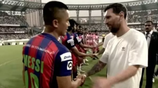 തിങ്ങിനിറഞ്ഞ സ്റ്റേഡിയത്തിന് നടുവിലായിരുന്നു ഞായറാഴ്ച വൈകുന്നേരം മെസ്സി വന്നിറങ്ങിയത്. ആരാധകര് ആര്പ്പുവിളികളോടെ മെസ്സിയെ വരവേറ്റു. സച്ചിന് തന്റെ പത്താം നമ്പര് ജേഴ്സി മെസ്സിക്ക് സമ്മാനിച്ചു. പിന്നാലെ 2026 ലോകകപ്പിന്റെ ഔദ്യോഗിക പന്ത് മെസ്സി സച്ചിനും സമ്മാനിച്ചു. സുനില് ഛേത്രിക്കും ഫഡ്നാവിസിനും മെസ്സി ലോകകപ്പ് ജേഴ്സിയും സമ്മാനിച്ചു. സഹതാരങ്ങളായ ലൂയിസ് സുവാരസും റോഡ്രിഗോ ഡി പോളും മെസ്സിക്കൊപ്പമുണ്ടായിരുന്നു.