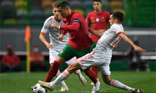 ലിസ്ബണ്: പോര്ച്ചുഗല്-സ്പെയിന് അന്താരാഷ്ട്ര സൗഹൃദ ഫുട്ബോള് മല്സരം ഗോള്രഹിത സമനിലയില് കലാശിച്ചു.മല്സരത്തില് സ്പെയിന് നിരവധി അവസരങ്ങള് സൃഷ്ടിച്ചെങ്കിലും ഗോള് പിറന്നില്ല. ടീനേജ് താരം അന്സു ഫാത്തിയും സ്പെയിനിനായി കളിച്ചു. ക്രിസ്റ്റിയാനോ റൊണാള്ഡയുടെ നിറം മങ്ങിയ പ്രകടനത്തിനാണ് മല്സരം സാക്ഷ്യം വഹിച്ചത്. പോര്ച്ചുഗലിനായി ഫ്ളിക്സ്, ബ്രൂണോ ഫെര്ണാണ്ടസ് എന്നിവരും കളിച്ചു. മറ്റൊരു മല്സരത്തില് ജര്മ്മനിയെ തുര്ക്കി സമനിലയില് തളച്ചു. 3-3നാണ് തുര്ക്കി ജര്മ്മന് പടയെ പിടിച്ചുകെട്ടിയത്. ഡ്രാക്സല്ര്, നുഹൗസ്, വാല്ഷമിഡറ്റ് എന്നിവരാണ് ജര്മ്മനിക്കായി സ്കോര് ചെയ്തത്. തുഫാന് കരാക്കാ, കരാമന് എന്നിവരാണ് തുര്ക്കിയ്ക്കായി സ്കോര് ചെയ്തവര്. കരാമന്റെ ഇഞ്ചുറി ടൈം ഗോളാണ് അവര്ക്ക് സമനില നല്കിയത്. മാള്ഡൊവയെ എതിരില്ലാത്ത ആറ് ഗോളിനാണ് ഇറ്റലി തോല്പ്പിച്ചത്. ക്രിസ്റ്റന്റേ, കപ്പാറ്റൂ, ഷരാവൈ, ബെറാര്ഡി എന്നിവരാണ് ഇറ്റലിയ്ക്കായി വലകുലിക്കിയവര്.ഗ്രീസിനെ ഓസ്ട്രിയ 2-1ന് തോല്പ്പിച്ചു.