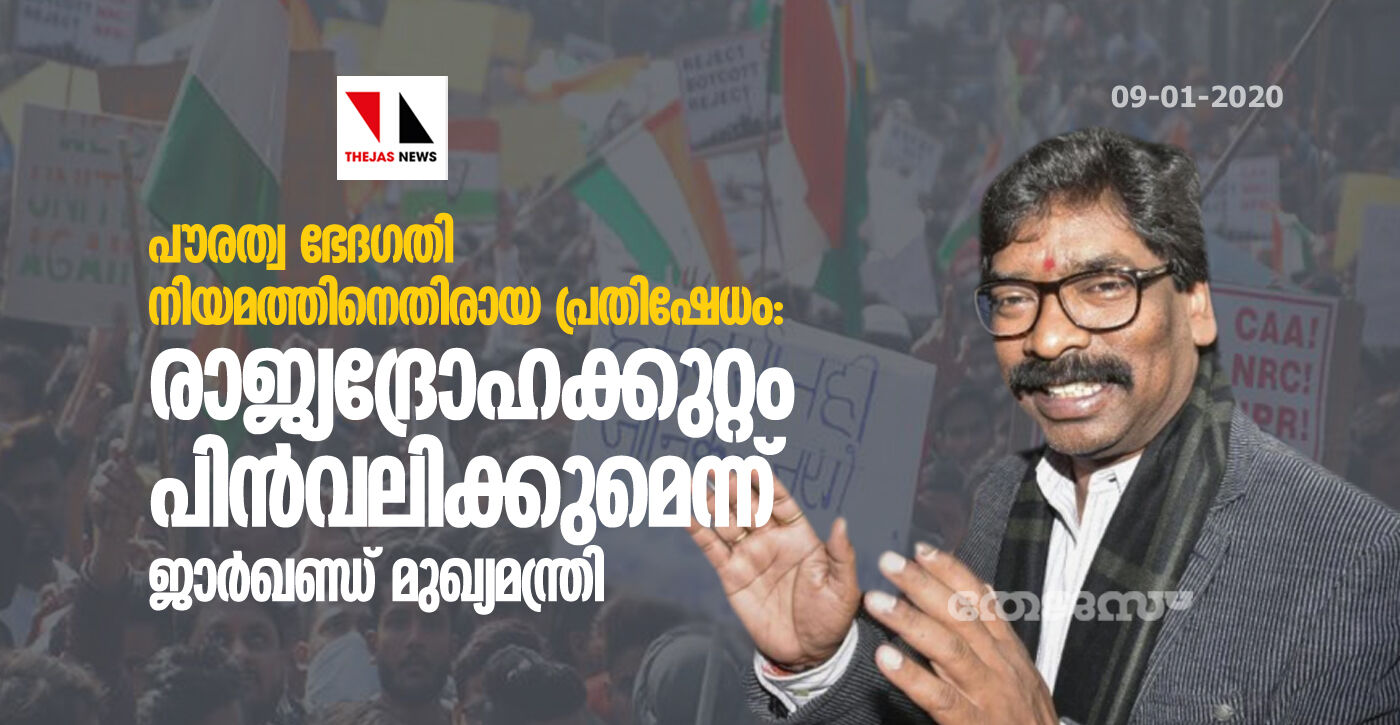 പൗരത്വ ഭേദഗതി നിയമത്തിനെതിരായ പ്രതിഷേധം: രാജ്യദ്രോഹക്കുറ്റം പിന്വലിക്കുമെന്ന് ജാര്ഖണ്ഡ് മുഖ്യമന്ത്രി