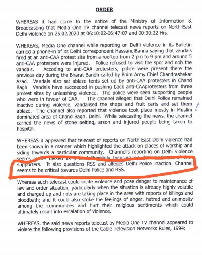 മീഡിയാ വണ് ചാനല് ഫെബ്രുവരി 25ന് വൈകീട്ട് 6.10നു 6.47നും ഇടയില് 30 മിനുട്ട് പ്രക്ഷേപണം ചെയ്ത വാര്ത്തയില് ഡല്ഹി കറസ്പോണ്ടന്റ് ഹസനുല് ബന്ന സിഎഎ വിരുദ്ധ പ്രക്ഷോഭകര്ക്കു നേരെ രണ്ടു മണി മുതല് ഒമ്പത് മണി വരെ വെടിവയ്പുണ്ടായെന്നും അഞ്ചുപേര്ക്ക് പരിക്കേറ്റെന്നും വാര്ത്ത നല്കിയെന്നും മന്ത്രാലയത്തിന്റെ നോട്ടീസിലുണ്ട്. പോലിസ് സംഭവ സ്ഥലം സന്ദര്ശിക്കാനോ കലാപകാരികളെ തടയാനോ ശ്രമിച്ചില്ല, പോലിസ് സിഎഎ അനുകൂലികള്ക്ക് പിന്തുണ നല്കുന്നത് കാണാം, വ്യാപാര സ്ഥാപനങ്ങള് കത്തിക്കുമ്പോള് ഡല്ഹി പോലിസ് നിഷ്ക്രിയരായി, മുസ് ലിം ഭൂരിപക്ഷ മേഖലയായ ചാന്ദ് ബാഗിലാണ് ഏറ്റവും കൂടുതല് അക്രമം അരങ്ങേറിയത് തുടങ്ങിയ വാര്ത്തകള് അക്രമത്തിനു പ്രേരിപ്പിക്കുന്നതും ക്രമസമാധാനപാലനത്തിന് അപകടകരവുമാണെന്നാണ് പ്രക്ഷേപണ വിലക്കിന് ആധാരമായ കാരണങ്ങളില് വ്യക്തമാക്കിയിട്ടുള്ളത്.