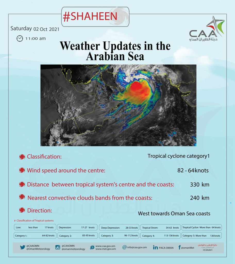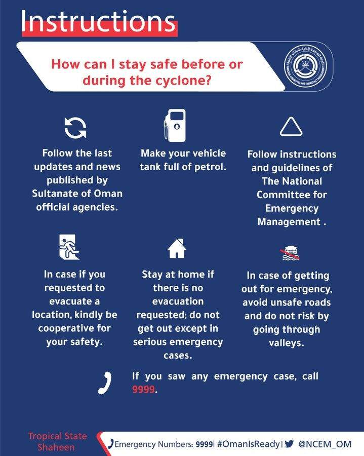 ഷഹീന് ചുഴലിക്കാറ്റ് ഒമാന് തീരത്തുനിന്ന് 500 കിലോമീറ്റര് അകലെയാണ് ഇപ്പോള് നിലകൊള്ളുന്നതെന്ന് ഒമാനി മെട്രോളജിക്കല് അതോറിറ്റി സ്ഥിരീകരിച്ചിട്ടുണ്ട്. ഷഹീന് ചുഴലിക്കാറ്റിനെ നേരിടാന് ഒമാന് ദേശീയ ദുരന്തനിവാരണ സമിതി എല്ലാവിധ തയ്യാറെടുപ്പുകളും നടത്തിക്കഴിഞ്ഞു. മസ്കത്ത് മുതല് വടക്കന് ബാത്തിന ഗവര്ണറേറ്റുകള് വരെയുള്ള തീരപ്രദേശങ്ങളിലേക്ക് ഷഹീന് ചുഴലിക്കാറ്റ് നീങ്ങുമെന്നാണ് പ്രതീക്ഷിക്കുന്നത്.