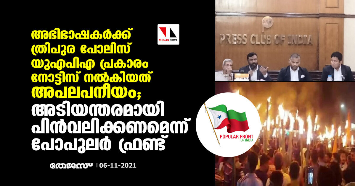 അഭിഭാഷകര്ക്ക് ത്രിപുര പോലിസ് യുഎപിഎ പ്രകാരം നോട്ടിസ് നല്കിയത് അപലപനീയം; അടിയന്തരമായി പിന്വലിക്കണമെന്ന് പോപുലര്ഫ്രണ്ട്
