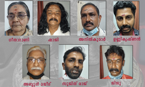 പാവറട്ടി പാടൂര് മതിലകത്ത് അബ്ദുള് മജീദ് (65), തിരുവനന്തപുരം തിരുമല സ്വദേശിയായ ഗീത റാണി (63), പത്തനംതിട്ട കളരിക്കല് സ്വദേശി ചെല്ലപ്പമണി ഷാജി (38), ആലപ്പുഴ കറ്റാനം സ്വദേശി ഉണ്ണികൃഷ്ണന് (33), സുജിത് രാജ് (39), കറമ്പക്കാട്ടില് ജിജു (45), തച്ചിലേത്ത് അനില് കുമാര് (40) എന്നിവരാണ് പിടിയിലായത്.