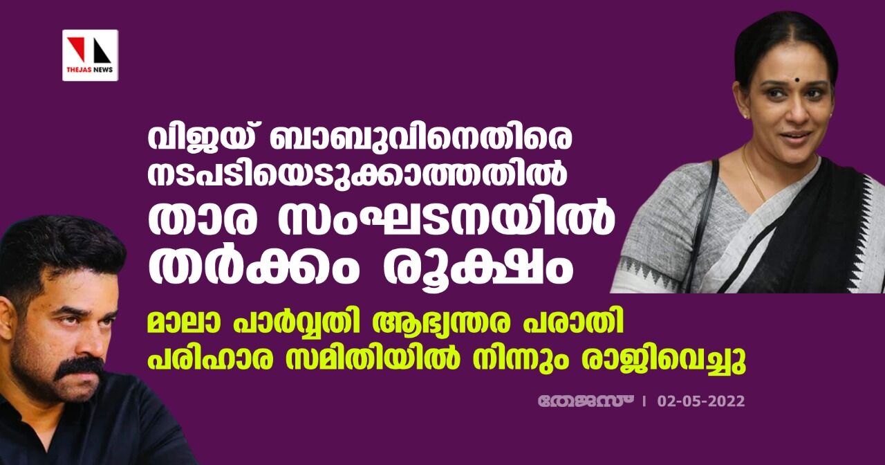 വിജയ് ബാബുവിനെതിരെ നടപടിയെടുക്കാത്തതില് താര സംഘടനയില് തര്ക്കം രൂക്ഷം;മാലാ പാര്വ്വതി ആഭ്യന്തര പരാതി പരിഹാര സമിതിയില് നിന്നും രാജിവെച്ചു