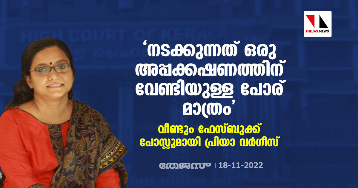 'നടക്കുന്നത് ഒരു അപ്പക്കഷണത്തിന് വേണ്ടിയുള്ള പോര് മാത്രം'; വീണ്ടും ഫേസ്ബുക്ക് പോസ്റ്റുമായി പ്രിയാ വര്ഗീസ്