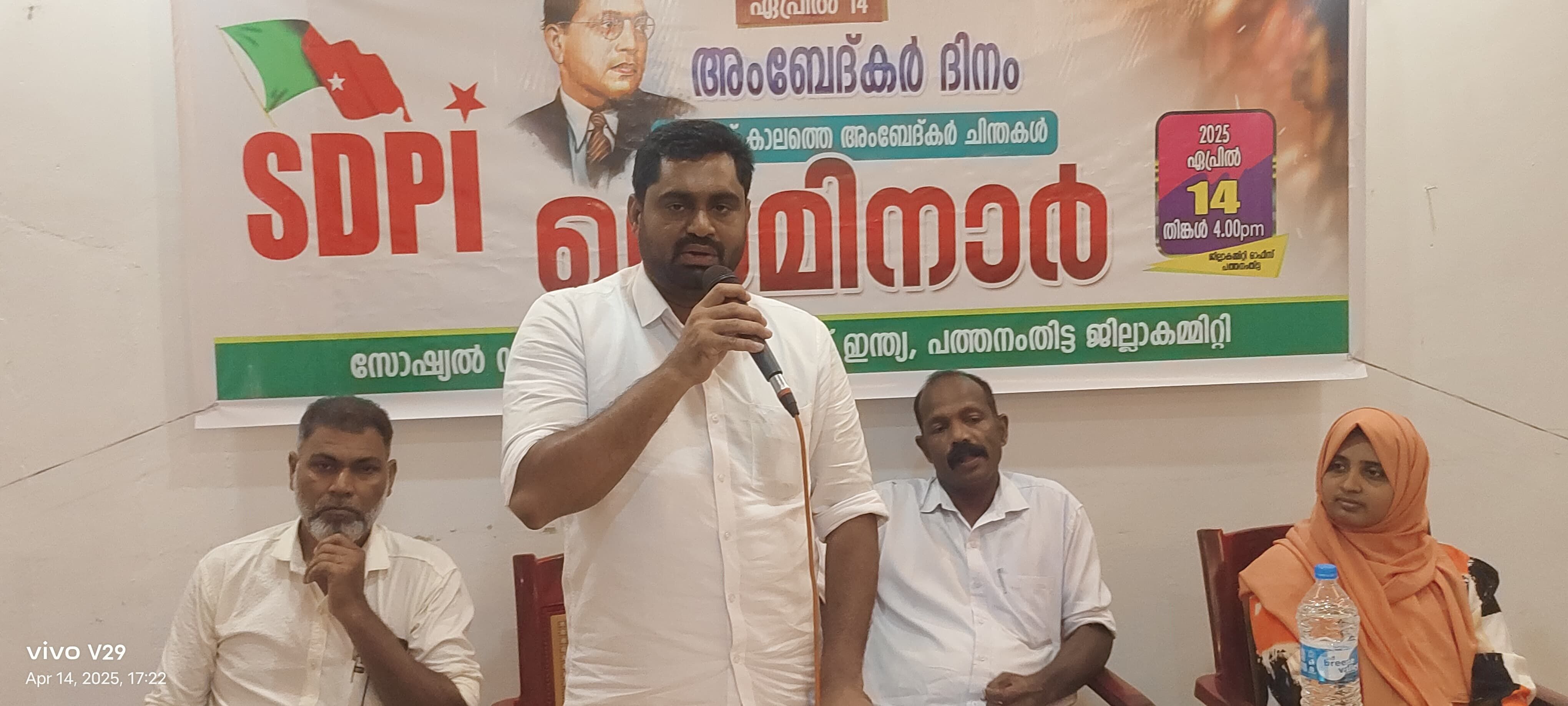 പത്തനംതിട്ട: ഏപ്രിൽ 14 അംബേദ്കർ ദിനത്തിൽ എസ്ഡിപിഐ പത്തനംതിട്ട ജില്ലാ കമ്മിറ്റിയുടെ നേതൃത്വത്തിൽ ഫാസിസ്റ്റ് കാലത്തെ അംബേദ്കർ ചിന്തകൾ എന്ന വിഷയത്തിൽ സെമിനാർ സംഘടിപ്പിച്ചു. ജില്ലാ പ്രസിഡന്റ് എസ് മുഹമ്മദ് അനീഷ് സെമിനാർ ഉദ്ഘാടനം ചെയ്തു. ജില്ലാ വൈസ് പ്രസിഡന്റ് എം ഡി ബാബു അധ്യക്ഷത വഹിച്ചു. ജില്ലാ ജനറൽ സെക്രട്ടറി ഓർഗനൈസർ അൻസാരി മുട്ടാർ, ജില്ലാ സെക്രട്ടറിമാരായ ഷെയ്ക്ക് നജീർ, ഷഫ്ന റാഷിദ്, ജില്ലാ ട്രഷറർ ഷാജി കോന്നി, ജില്ലാ സെക്രട്ടറിയേറ്റ് അംഗം സിയാദ് നിരണം, ജില്ലാ കമ്മിറ്റി അംഗങ്ങളായ ബിനു ജോർജ്, അംജിത മോൾ, ആറന്മുള മണ്ഡലം പ്രസിഡന്റ് എസ് മുഹമ്മദ് റാഷിദ് സംസാരിച്ചു.