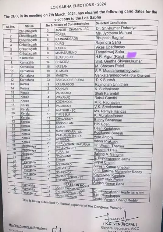 വ്യാഴാഴ്ച രാത്രി എഐസിസി ആസ്ഥാനത്ത് നടന്ന യോഗത്തിലാണ് ആദ്യഘട്ട പട്ടികയ്ക്ക് രൂപംനല്കിയത്. അധ്യക്ഷന് മല്ലികാര്ജുന് ഖാര്ഗെ, സോണിയാ ഗാന്ധി, ജനറല് സെക്രട്ടറി കെ സി വേണുഗോപാല്, ഡി കെ ശിവകുമാര്, കേരളത്തിന്റെ സ്ക്രീനിങ് കമ്മിറ്റി ചെയര്മാന് ഹരീഷ് ചൗധരി, കെപിസിസി അധ്യക്ഷന് കെ സുധാകരന്, പ്രതിപക്ഷനേതാവ് വി ഡി സതീശന്, മുന് പ്രതിപക്ഷനേതാവ് രമേശ് ചെന്നിത്തല, ശശി തരൂര് തുടങ്ങിയവരാണ് ചര്ച്ചയില് പങ്കെടുത്തത്. കേരളത്തിലേത് കൂടാതെ ഛത്തീസ്ഗഢ്, കര്ണാടക, മേഖാലയ, നാഗാലാന്ഡ്, സിക്കിം, തെലങ്കാന, ത്രിപുര എന്നീ സംസ്ഥാനങ്ങളിലേതടക്കം 39 സ്ഥാനാര്ഥികളുടെ പേരുകളാണ് ഇന്ന് പ്രഖ്യാപിച്ചത്.
