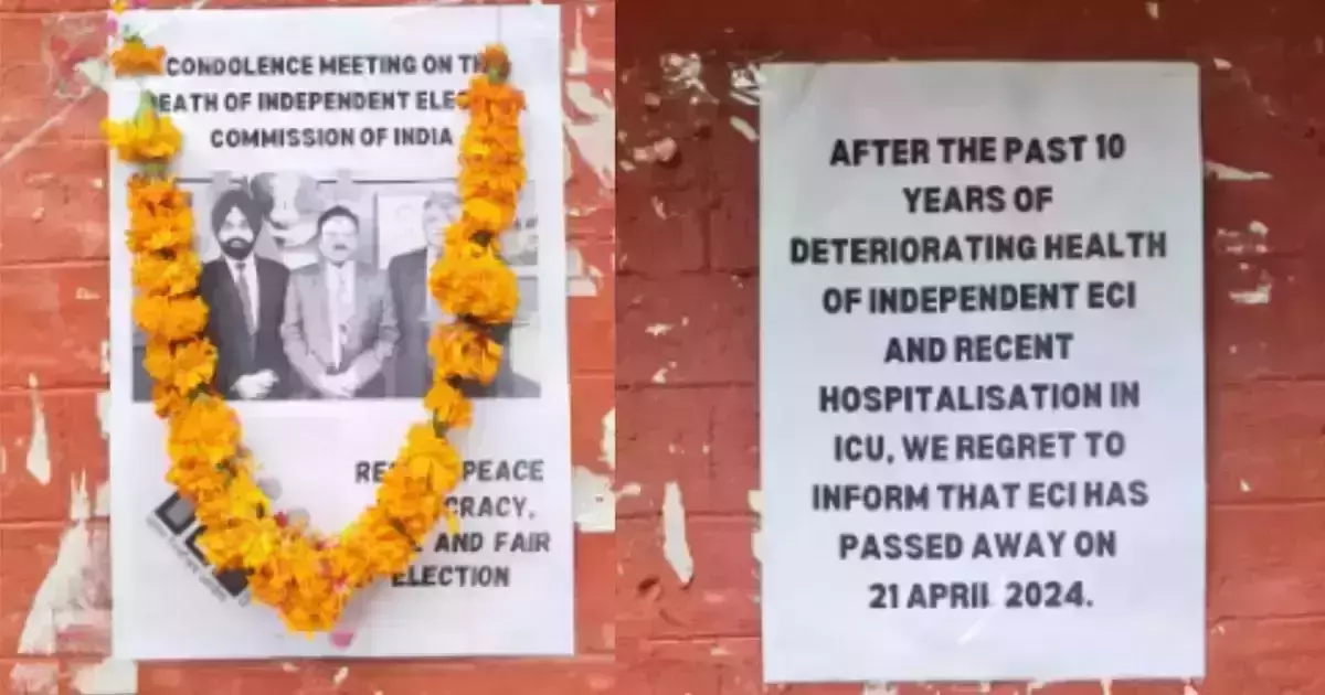 'സ്വാതന്ത്രമായി പ്രവര്ത്തിക്കേണ്ട തിരഞ്ഞെടുപ്പ് കമ്മീഷന് കഴിഞ്ഞ 10 വര്ഷമായി അനാരോഗ്യത്തെ തുടര്ന്ന് ആരോഗ്യനില വഷളായതോടെ ഐസിയുവില് അടുത്തിടെ പ്രവേശിപ്പിച്ചതിനും ശേഷം 2024 ഏപ്രില് 21ന് തിരഞ്ഞെടുപ്പ് കമ്മീഷന് അന്തരിച്ചുവെന്ന് അറിയിക്കുന്നതില് ഞങ്ങള് ഖേദിക്കുന്നു' എന്നാണ് പോസ്റ്ററില് ഉള്ളത്. ഇന്ത്യയുടെ മുഖ്യ തിരഞ്ഞെടുപ്പ് കമ്മീഷണര് രാജീവ് കുമാറിനൊപ്പം പുതുതായി നിയമിതരായ തിരഞ്ഞെടുപ്പ് കമ്മീഷണര്മാരായ ഗ്യാനേഷ് കുമാര്, ഡോ. സുഖ്ബീര് സിംഗ് സന്ധു എന്നിവരുടെ ചിത്രങ്ങളും മാലയിട്ട പോസ്റ്ററില് ഉണ്ട്.