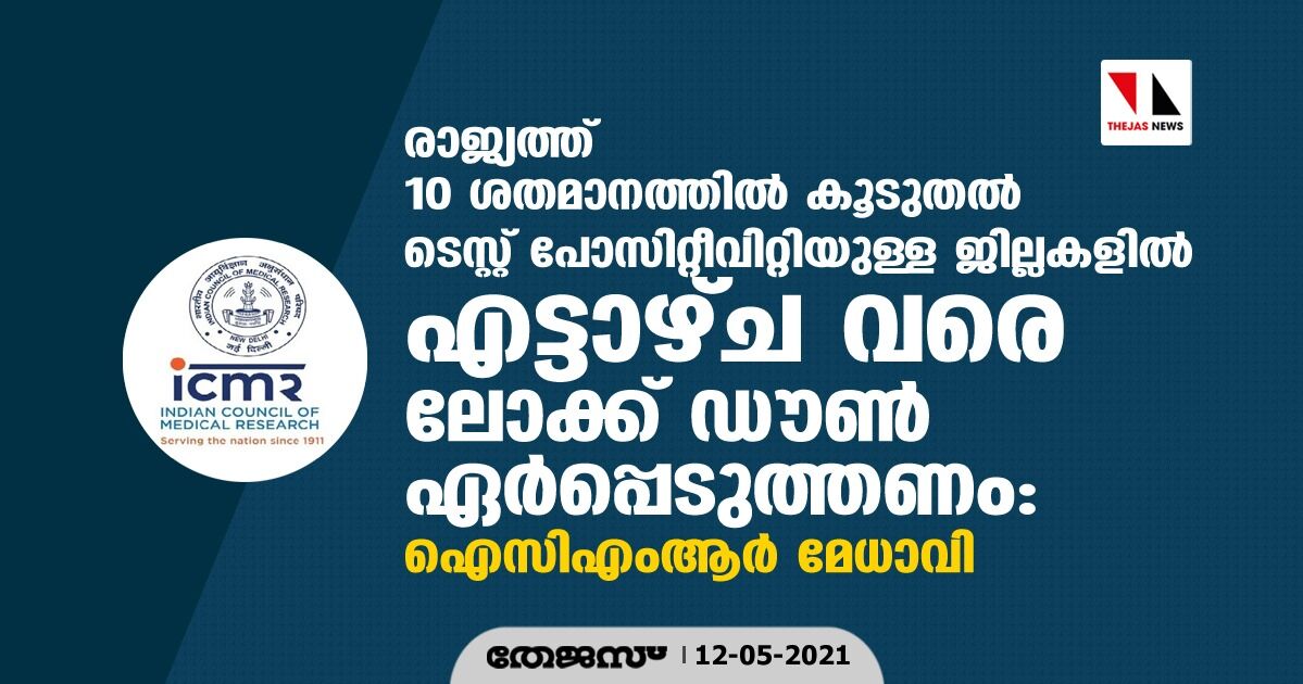 രാജ്യത്ത് 10 ശതമാനത്തില് കൂടുതല് ടെസ്റ്റ് പോസിറ്റീവിറ്റിയുള്ള ജില്ലകളില് എട്ടാഴ്ച വരെ ലോക്ക് ഡൗണ് ഏര്പ്പെടുത്തണം: ഐസിഎംആര് മേധാവി