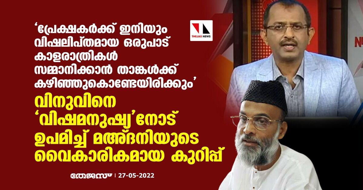 'പ്രേക്ഷകര്ക്ക് ഇനിയും വിഷലിപ്തമായ ഒരുപാട് കാളരാത്രികള് സമ്മാനിക്കാന് താങ്കള്ക്ക് കഴിഞ്ഞുകൊണ്ടേയിരിക്കും'; വിനുവിനെ 'വിഷമനുഷ്യ'നോട് ഉപമിച്ച് മഅ്ദനിയുടെ വൈകാരികമായ കുറിപ്പ്