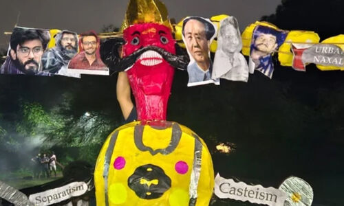 രാവണന്റെ പ്രതിമയില് ഉമര് ഖാലിദിന്റെയും ഷര്ജീലിന്റെയും ഫോട്ടോ ചേര്ത്ത് എബിവിപി