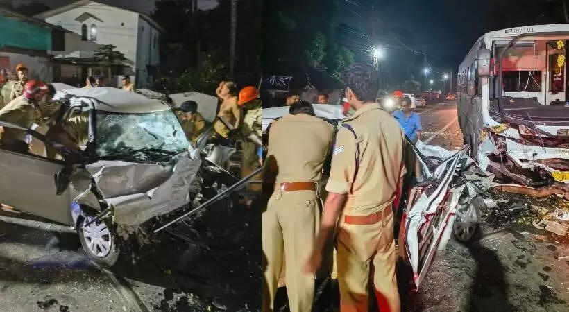 ശബരിമല തീര്ത്ഥാടകരുടെ ബസും കാറും കൂട്ടിയിടിച്ച് നാല് മരണം; മരിച്ചവരില് നവദമ്പതികളും
