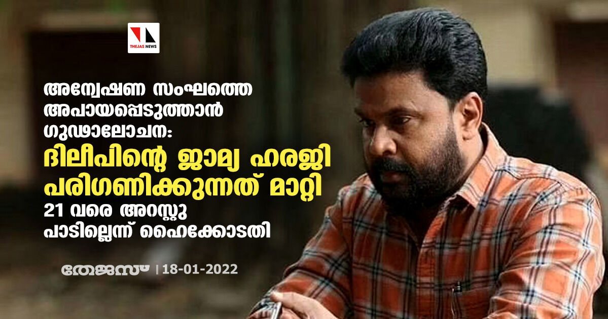 അന്വേഷണ സംഘത്തെ അപായപ്പെടുത്താന് ഗുഢാലോചന:ദിലീപിന്റെ ജാമ്യ ഹരജി പരിഗണിക്കുന്നത് മാറ്റി; 21 വരെ അറസ്റ്റു പാടില്ലെന്ന് ഹൈക്കോടതി