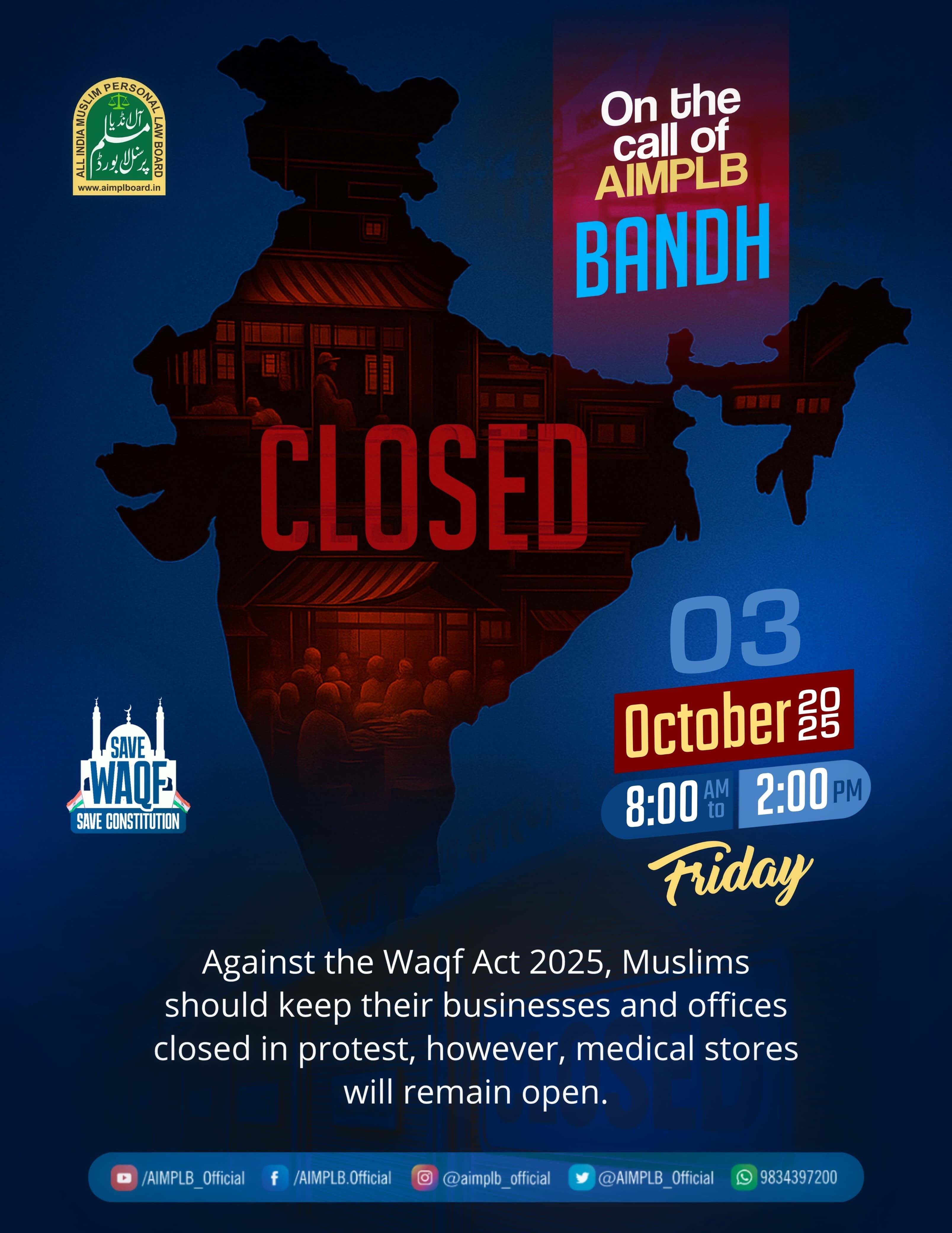 വഖ്ഫ് ഭേദഗതി നിയമം: ഒക്ടോബര് മൂന്നിന് അഖിലേന്ത്യാ ബന്ദിന് ആഹ്വാനം ചെയ്ത് മുസ്ലിം വ്യക്തിനിയമബോര്ഡ്