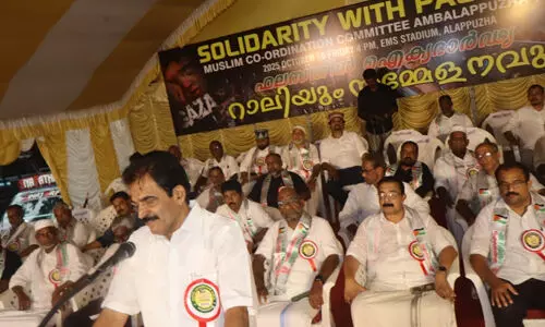 ഫലസ്തീന് ജനതയ്ക് ജീവിക്കാന് ഉള്ള അവകാശത്തെ പിന്തുണയ്ക്കുയാണ് വേണ്ടത്. എക്കാലവും ഫലസ്തിനെ പിന്തുണയ്ക്കുകയാണ് ഇന്ഡ്യ ചെയ്തിട്ടുള്ളത്. ലക്ഷക്കണക്കിന് മനുഷ്യരെ കൊന്ന ഇസ്രായേലിനെ ഇപ്പോള് സമാധാന കരാറിന്റെ പേരില് മോദി അഭിനന്ദിയ്ക്കുകയാണ് ചെയ്യുന്നതെന്നും കെ സി വേണുഗോപാല് പറഞ്ഞു. മുസ്ലിം കോ ഓര്ഡിനേഷന് കമ്മറ്റി ചെയര്മാന് എ എം നസീര് അദ്ധ്യക്ഷത വഹിച്ചു. നവാസ് മന്നാനി പനവൂര് മുഖ്യപ്രഭാഷണം നടത്തി. വര്ക്കിംഗ് ചെയര്മാന് സി എ സലിം ചക്കിട്ടപറമ്പില് പ്രതിജ്ഞ ചൊല്ലി കൊടുത്തു. ജനറല് കണ്വീനര് ഇക്ബാല് സാഗര് പ്രമേയവതരണം നടത്തി. എച്ച് സലാം എംഎല്എ, പി പി ചിത്തരജഞ്ഞന് എംഎല്എ, തിരുവനന്തപുരം എസ്എന് ഇന്റര്നാഷണല് സ്ക്കൂള് ഓഫ് ലൈഫ് മഠാധിപതി ബ്രഹ്മശ്രീ സ്വാമി സുഖാ കാഷ സരസ്വതി, ഫാദര് സേവ്യര് കുടിയാശേരി, വര്ക്കിംഗ് കണ്വീനര് ഹാരീസ് സലിം, ട്രഷറര് അഷറഫ് പനക്കല് സംസാരിച്ചു.