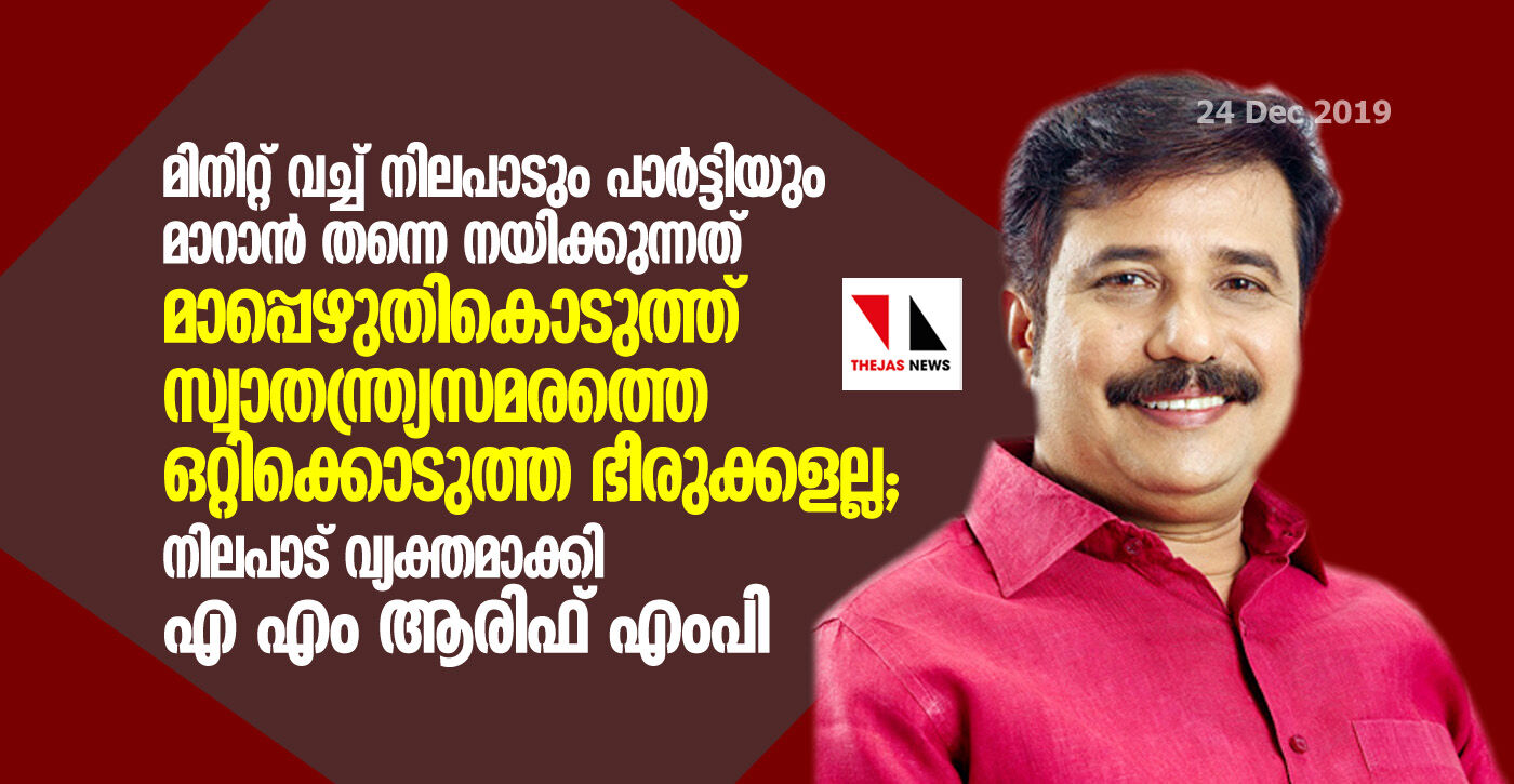 മിനിറ്റ് വച്ച് നിലപാടും പാര്ട്ടിയും മാറാന് തന്നെ നയിക്കുന്നത് മാപ്പെഴുതികൊടുത്ത് സ്വാതന്ത്ര്യസമരത്തെ ഒറ്റിക്കൊടുത്ത ഭീരുക്കളല്ല; നിലപാട് വ്യക്തമാക്കി എ എം ആരിഫ് എംപി