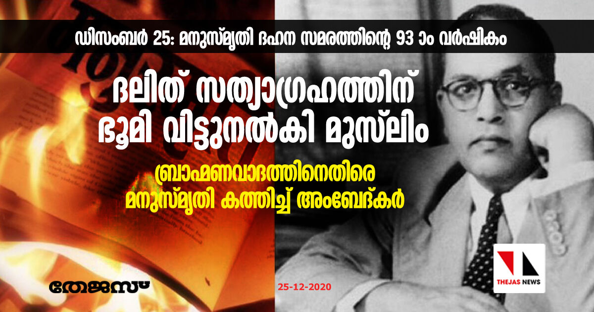 ദലിത് സത്യാഗ്രഹത്തിന് ഭൂമി വിട്ടുനല്കി മുസ്ലിം; ബ്രാഹ്മണവാദത്തിനെതിരെ മനുസ്മൃതി കത്തിച്ച് അംബേദ്കര് -ഡിസംബര് 25: മനുസ്മൃതി ദഹന സമരത്തിന്റെ 93 ാം വര്ഷികം