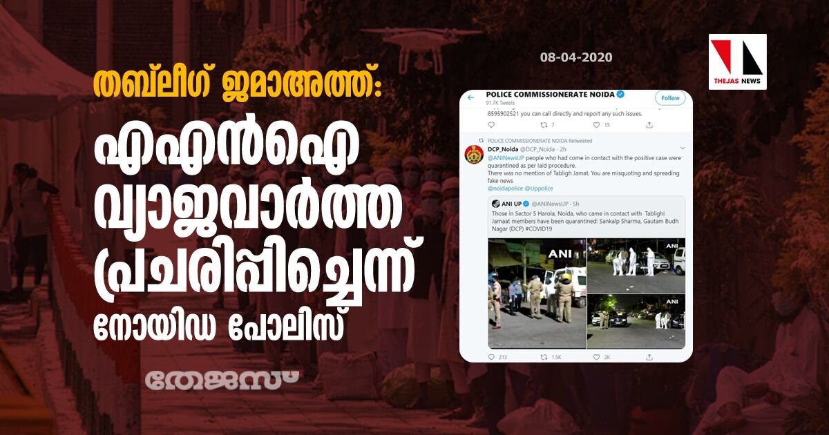 തബ്ലീഗ് ജമാഅത്ത്: എഎന്ഐ വ്യാജവാര്ത്ത പ്രചരിപ്പിച്ചെന്ന് നോയിഡ പോലിസ്