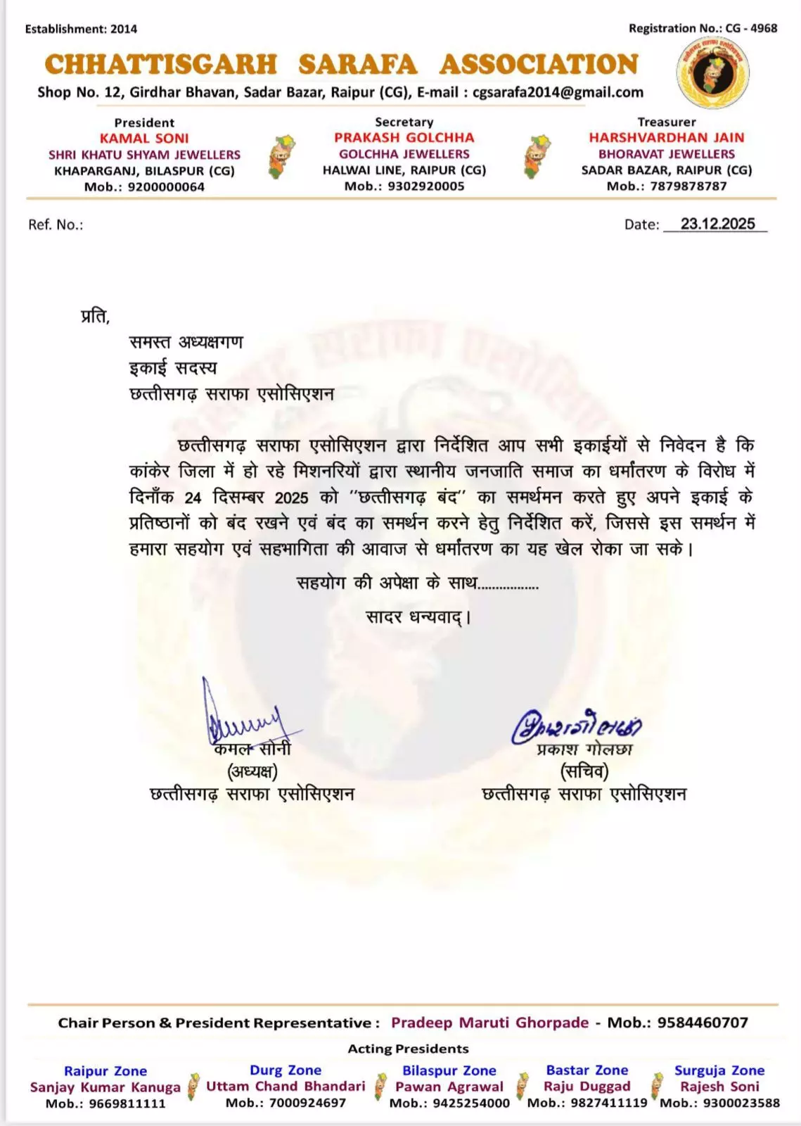 അടുത്തകാലത്തായി മതം മാറ്റം വര്ധിച്ചുവരുന്നതായി ഛത്തീസ്ഗഡ് ചേംബര് ഓഫ് കൊമേഴ്സ് ജനറല് സെക്രട്ടറി അജയ് ഭാസിന് ആരോപിച്ചു. പ്രത്യേക ലക്ഷ്യത്തിനായി മിഷണറിമാര് ഹിന്ദു സമുദായത്തെ തുണ്ടുതുണ്ടാക്കാന് ശ്രമിക്കുകയാണെന്നും അദ്ദേഹം ആരോപിച്ചു. സനാതന മതത്തെയും സാമൂഹിക ഐക്യത്തെയും സംരക്ഷിക്കാനാണ് ബന്ദെന്ന് സര്വ് സമാജ് പ്രതിനിധികള് പറഞ്ഞു. സര്വ് സമാജ് പ്രതിനിധികളുമായി എഎസ്പി സുഖാനന്ദന് റാത്തോഡ്, ലൈന് ഡിഎസ്പി ചന്ദ്രപ്രകാശ് തിവാരി, ദുര്ഗ് എഡിഎം അഭിഷേക് അഗര്വാള്, ഭിലായ് എസ്ഡിഎം ഹിതേഷ് പിസ്ദ തുടങ്ങിയവരും സംസാരിച്ചതായി റിപോര്ട്ടുകള് പറയുന്നു.