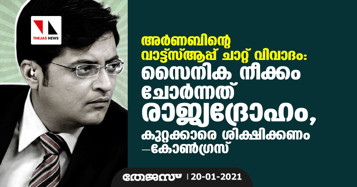അര്ണബിന്റെ വാട്ട്സ്ആപ്പ് ചാറ്റ് വിവാദം: സൈനിക നീക്കം ചോര്ന്നത് രാജ്യദ്രോഹം, കുറ്റക്കാരെ ശിക്ഷിക്കണം-കോണ്ഗ്രസ്