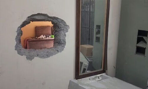 ബാങ്കിന്റെ ഭിത്തി തുരന്ന് മോഷണം; 40 ലക്ഷം രൂപയുടെ ആഭരണങ്ങള് കവര്ന്നു, മോഷ്ടാക്കള് കടിച്ച കുക്കുമ്പര് കണ്ടെത്തി