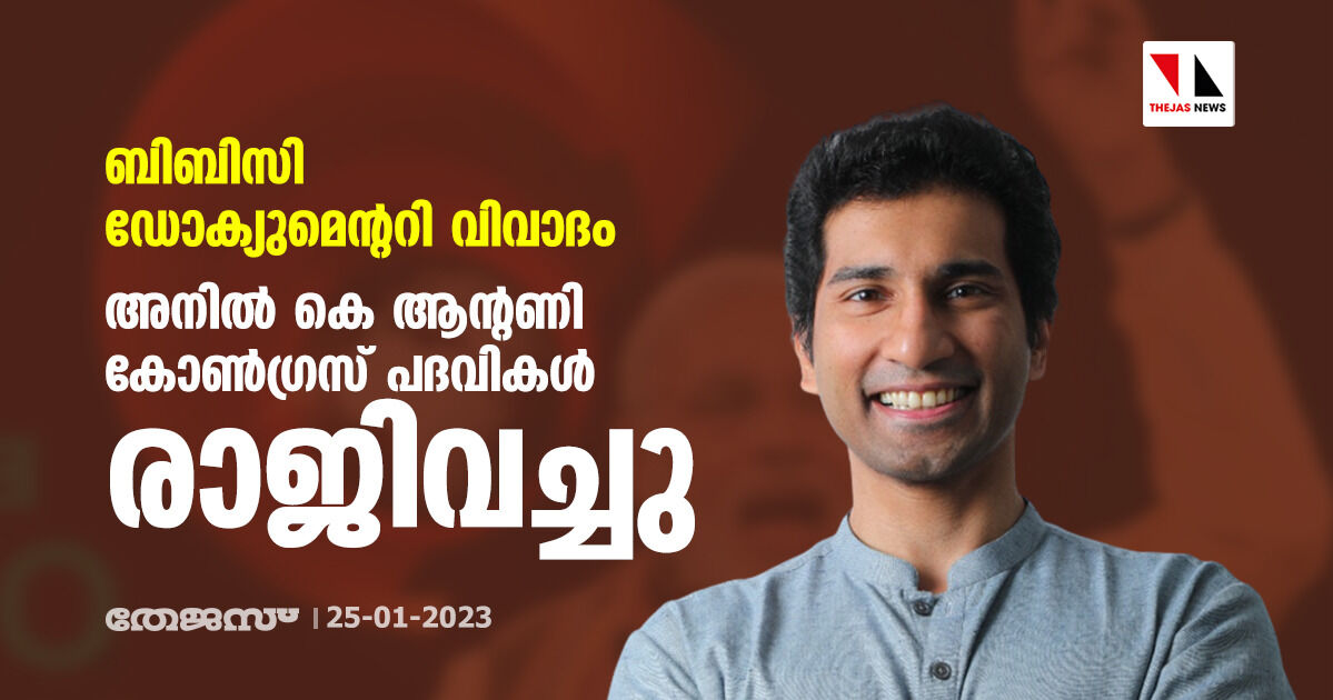 ബിബിസി ഡോക്യുമെന്ററി വിവാദം: അനില് കെ ആന്റണി കോണ്ഗ്രസ് പദവികള് രാജിവച്ചു