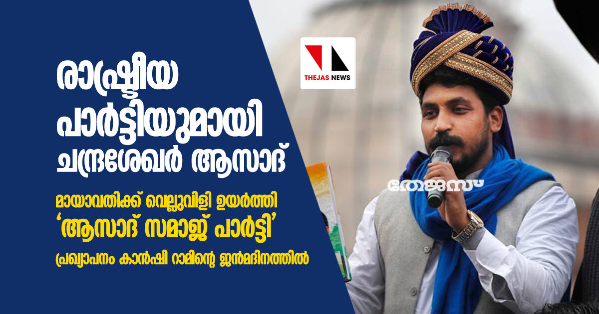 രാഷ്ട്രീയ പാര്ട്ടിയുമായി ചന്ദ്രശേഖര് ആസാദ്; മായാവതിക്ക് വെല്ലുവിളി ഉയര്ത്തി 'ആസാദ് സമാജ് പാര്ട്ടി'; പ്രഖ്യാപനം കാന്ഷി റാമിന്റെ ജന്മദിനത്തില്