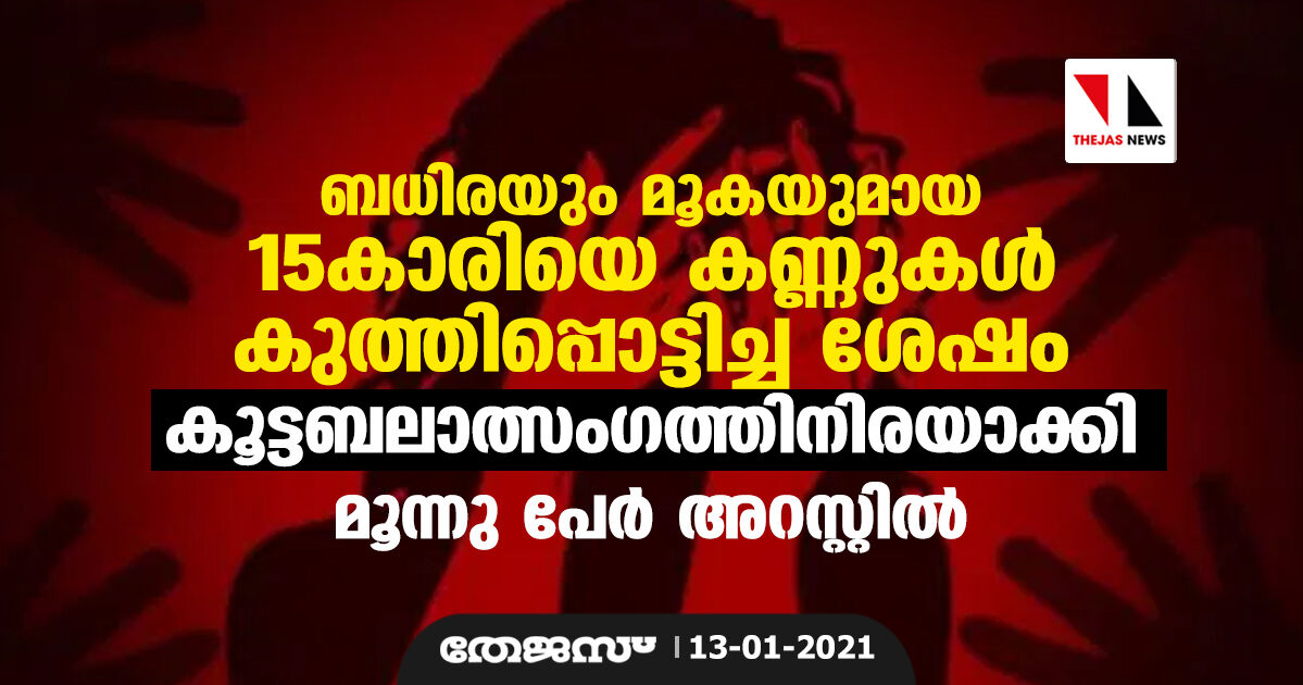 ബധിരയും മൂകയുമായ 15കാരിയെ കണ്ണുകള് കുത്തിപ്പൊട്ടിച്ച ശേഷം കൂട്ടബലാത്സംഗത്തിനിരയാക്കി
