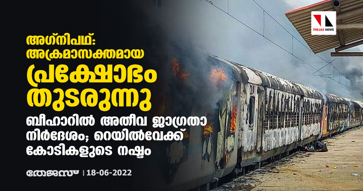 അഗ്നിപഥ്: അക്രമാസക്തമായ പ്രക്ഷോഭം തുടരുന്നു; ബീഹാറില് അതീവ ജാഗ്രതാ നിര്ദേശം, റെയില്വേക്ക് കോടികളുടെ നഷ്ടം