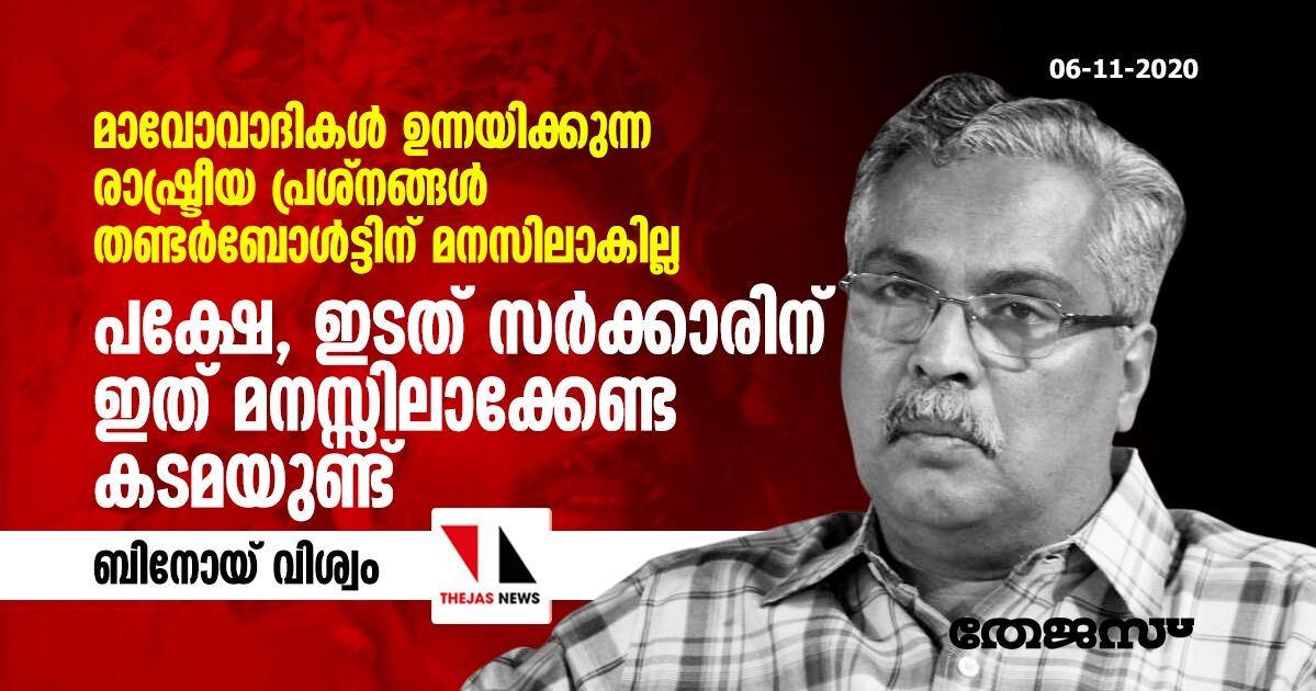 കോഴിക്കോട്: മാവോവാദികൾ ഉന്നയിക്കുന്ന രാഷ്ട്രീയ പ്രശ്നങ്ങൾ തണ്ടർബോൾട്ടിന് മനസിലാകില്ല, പക്ഷേ ഇടത് സർക്കാരിന് ഇത് മനസിലാക്കേണ്ട കടമയുണ്ടെന്ന് സിപിഐ നേതാവ് ബിനോയ് വിശ്വം. വയനാട് വാളാരം കുന്നിൽ തണ്ടർബോൾട്ട് വെടിവയ്പ്പിൽ മാവോവാദി പ്രവർത്തകൻ കൊല്ലപ്പെട്ട സംഭവത്തിൽ തേജസ് ന്യൂസിനോട് പ്രതികരിക്കുകയായിരുന്നു അദ്ദേഹം.