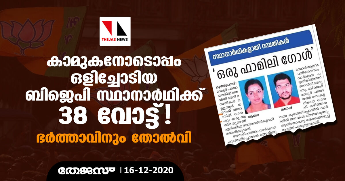 കണ്ണൂര്: തിരഞ്ഞെടുപ്പിനു ദിവസങ്ങള് മാത്രം ബാക്കിനില്ക്കെ കാമുകനോടൊപ്പം ഒളിച്ചോടി വിവാഹം കഴിച്ച ബിജെപി സ്ഥാനാര്ഥിക്കു ലഭിച്ചത് 38 വോട്ടുകള്. ഭാര്യയെ കൈവിട്ടതിനു പിന്നാലെ ഇതേ പഞ്ചായത്തില് താമര ചിഹ്നത്തില് ജനവിധി തേടിയ ഭര്ത്താവ് തോല്വി രുചിക്കുകയും ചെയ്തു. കണ്ണൂര് ജില്ലയിലെ മാലൂര് പഞ്ചായത്തില് എന്ഡിഎ സ്ഥാനാര്ഥിയായി മല്സരിച്ച സി ആതിരയ്ക്കാണ് 38 വോട്ടുകള് ലഭിച്ചത്. മാലൂര് പഞ്ചായത്തിലെ തന്നെ മറ്റൊരു വാര്ഡില് എന്ഡിഎ സ്ഥാനാര്ഥിയായി മത്സരിച്ച ആതിരയുടെ ഭര്ത്താവ് മന്നൂര് ധനേഷ് നിവാസില് ധനേഷിനും ജയിക്കാനായില്ല. വോട്ടെടെുപ്പിനു രണ്ടു ദിവസം മുമ്പാണ് കാസര്കോട് ബേഡഡുക്ക സ്വദേശിയായ കാമുകനോടൊപ്പം സ്ഥാനാര്ഥി ഒളിച്ചോടിയത്. സംഭവം വന് വാര്ത്താപ്രാധാന്യം നേടുകയും ബിജെപി വെട്ടിലാവുകയും ചെയ്തു. സ്ഥാനാര്ഥിയുടെ പിതാവിന്റെ പരാതിയില് കേസെടുത്തതോടെ ബേഡകത്തെത്തി പോലിസില് ഹാജരായ ശേഷമാണ് വിവാഹിതരായത്. പേരാവൂരിലുള്ള തന്റെ വീട്ടില് ചില രേഖകള് എടുക്കാനായി പോവുന്നുവെന്ന് പറഞ്ഞാണ് ആതിര വീട് വിട്ടിറങ്ങിയത്. തുടര്ന്ന് കാണാതായതിനെ തുടര്ന്ന് നടത്തിയ അന്വേഷണത്തിലാണ് കാമുകനോടൊപ്പം പോയതാണെന്നു വ്യക്തമായത്.
