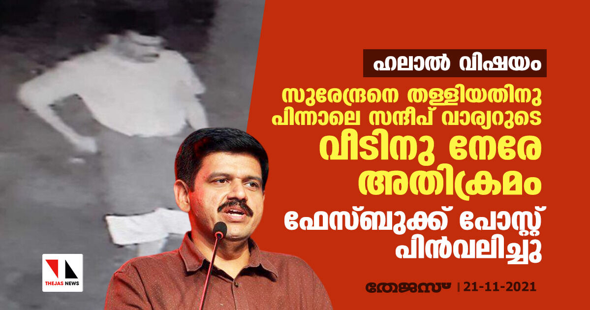 ഹലാല് വിഷയം: സുരേന്ദ്രനെ തള്ളിയതിനു പിന്നാലെ സന്ദീപ് വാര്യറുടെ വീട്ടിനു നേരെ അതിക്രമം; ഫേസ്ബുക്ക് പോസ്റ്റ് പിന്വലിച്ചു