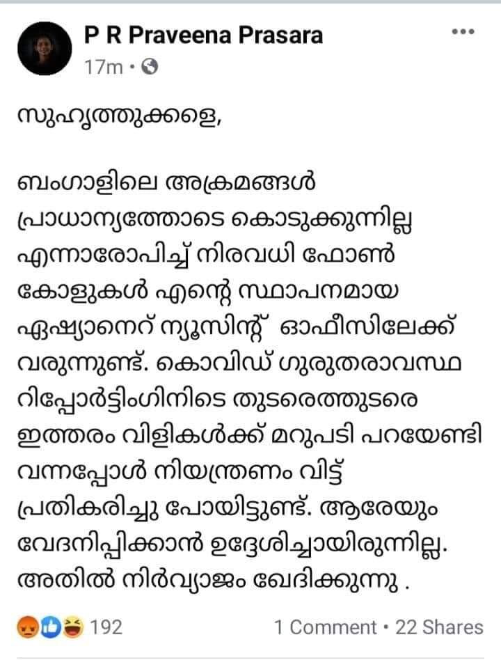 ഞങ്ങളുടെ സഹപ്രവത്തകയുടെ പ്രതികരണത്തില് അനാവശ്യവും അപക്വവും ആയ പരാമര്ശങ്ങള് കടന്നുകൂടിയതില് ഞങ്ങള് ഖേദിക്കുന്നു. തെറ്റ് പറ്റിയ വ്യക്തിക്കെതിരേ ഉചിതമായ നടപടികള് സ്വീകരിച്ചിട്ടുണ്ട് എന്നാണ് ഏഷ്യാനെറ്റ് എഡിറ്ററുടെ അറിയിപ്പ്.