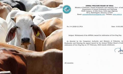 'കൗ ഹഗ് ഡേ' കേന്ദ്രസര്ക്കാര് പിന്വലിച്ചു