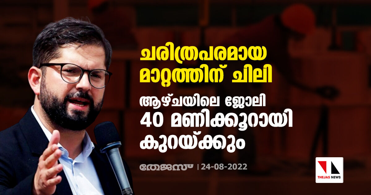 സാന്റിയാഗോ: തൊഴിലാളി അനുകൂല നിലപാട് നടപ്പിലാക്കി ചരിത്രം കുറിക്കാൻ ചിലിയൻ സർക്കാർ ഒരുങ്ങുന്നു. രാജ്യത്ത് ജോലി സമയം കുറയ്ക്കും എന്ന തിരഞ്ഞെടുപ്പ് വാഗ്ദാനം നടപ്പിലാക്കാനുള്ള ബിൽ പാസാക്കാനുള്ള ശ്രമങ്ങൾ നടക്കുന്നതായി ഇടതുപക്ഷക്കാരനായ ചിലി പ്രസിഡന്റ് ഗബ്രിയേൽ ബോറിക് ചൊവ്വാഴ്ച അറിയിച്ചു.